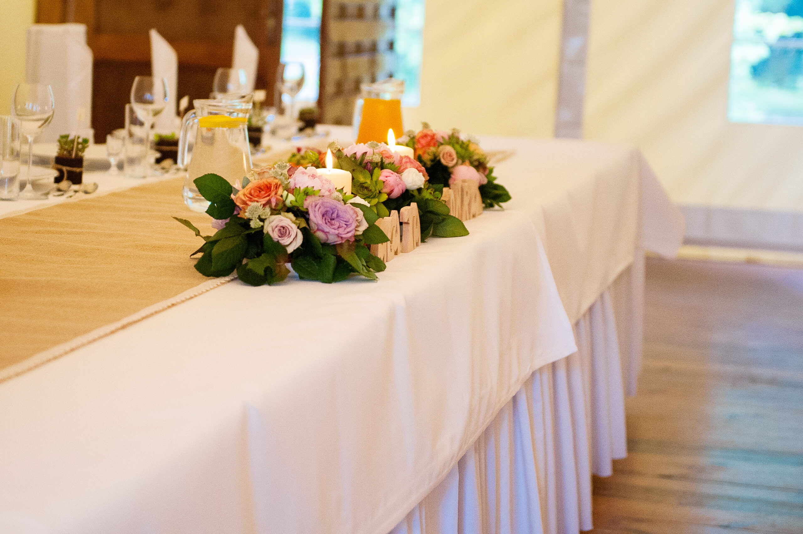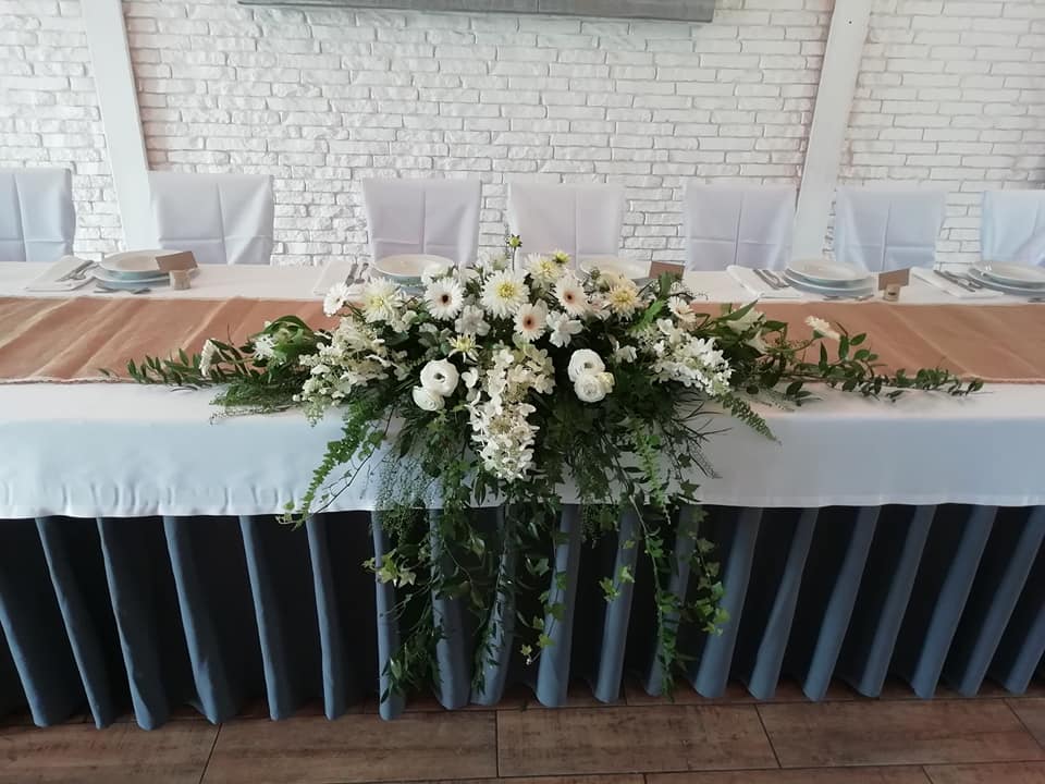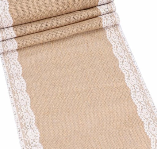 Bieżnik wykonany z naturalnej, jutowej tkaniny. Dookoła ozdobiony dodatkowo haftowaną tasiemką.