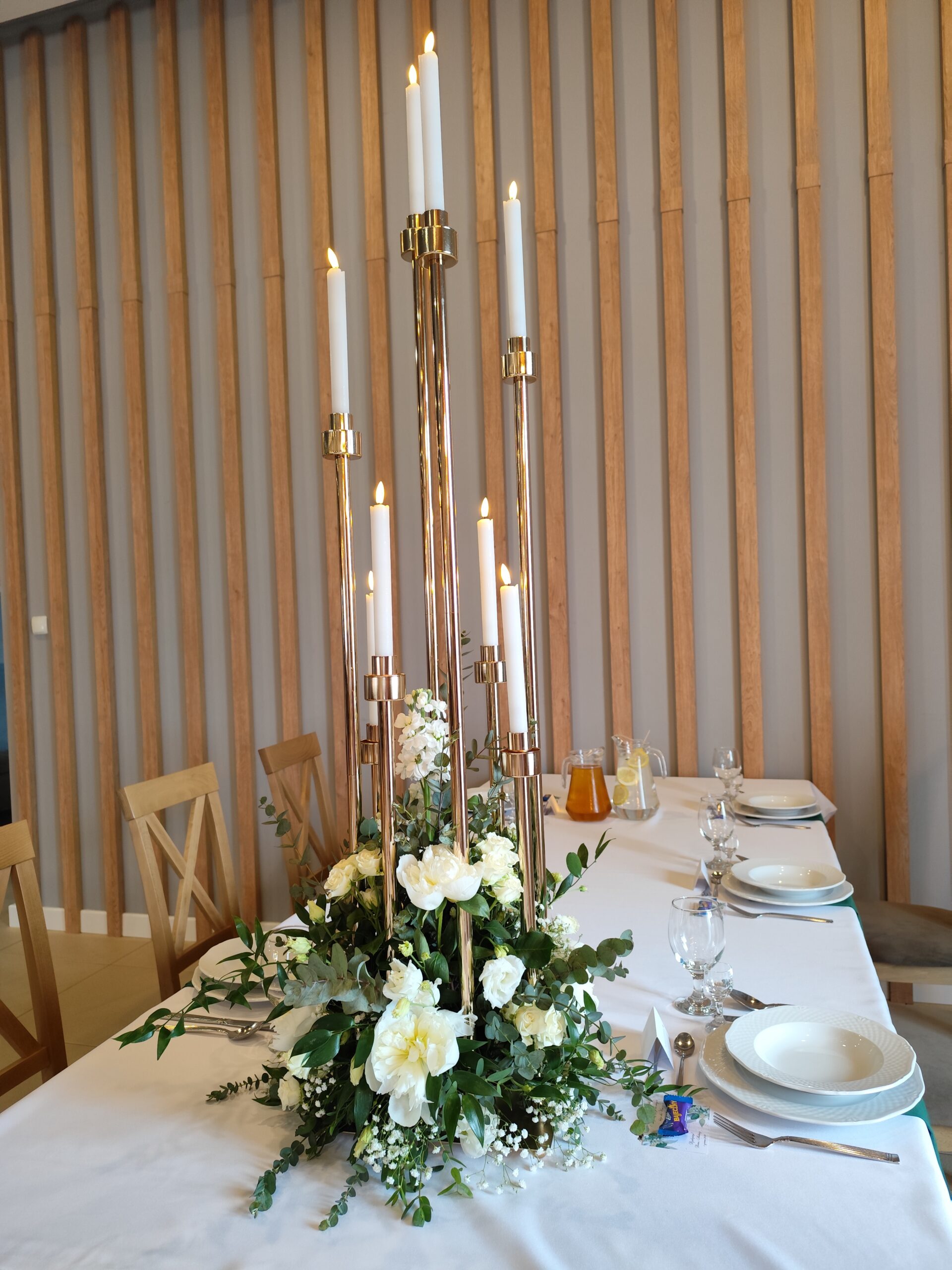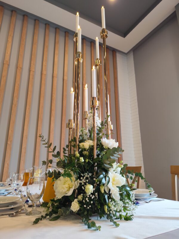 elegancki świecznik z dodatkiem odrobiny kwiatów stworzy piękną dekorację ślubną oraz na każdą inną okazję.